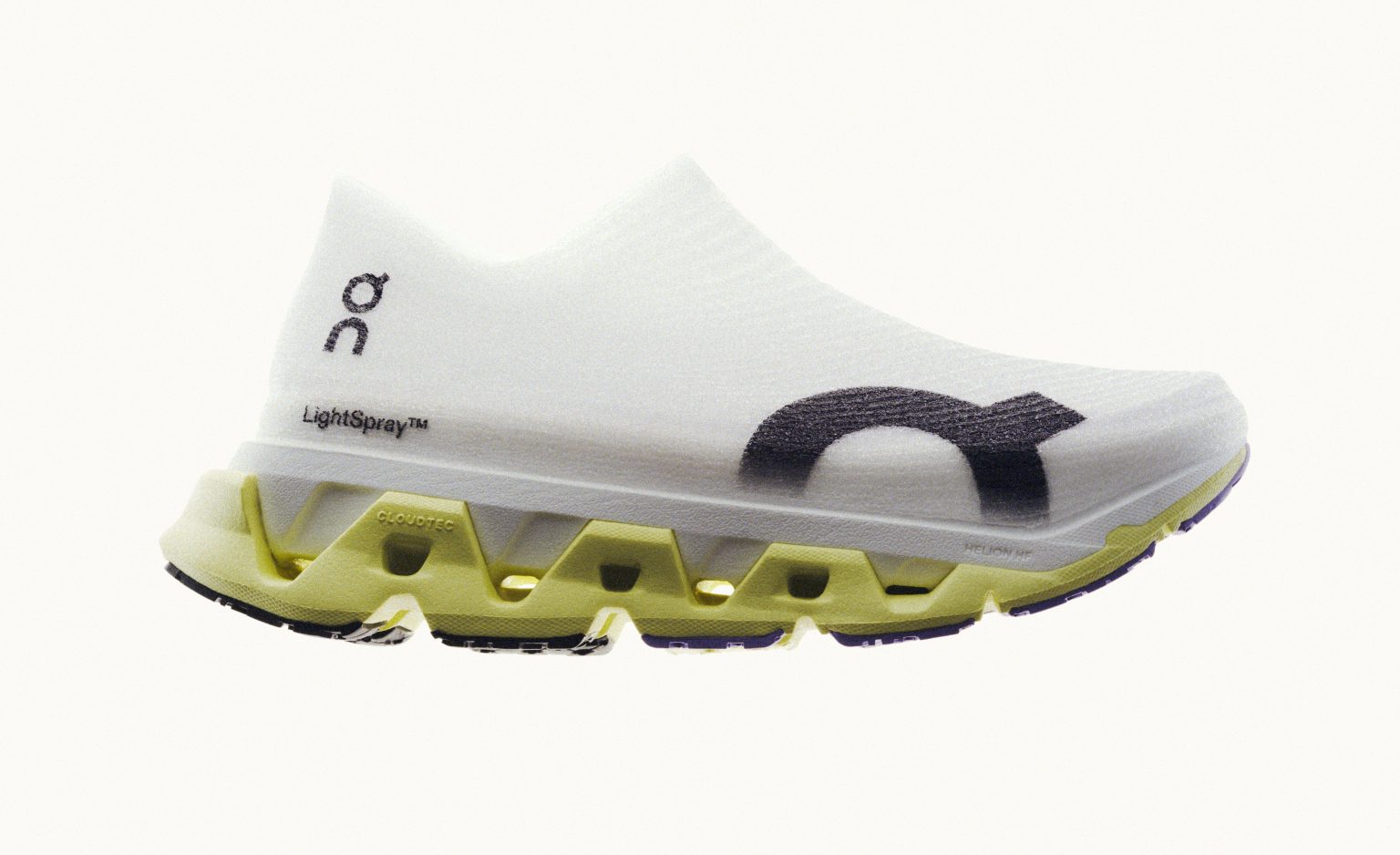 Shown here is the On LightSpray Cloudmonster 3 Hyper, a new super shoe from the brand that’s hitting retailers in early March. The upper retains its signature one-piece design made by a robot-controlled manufacturing process that sprays on a filament around a foot-shaped mold. The upper is then combined with a Helion HF hyper foam and CloudTec on the midsole.