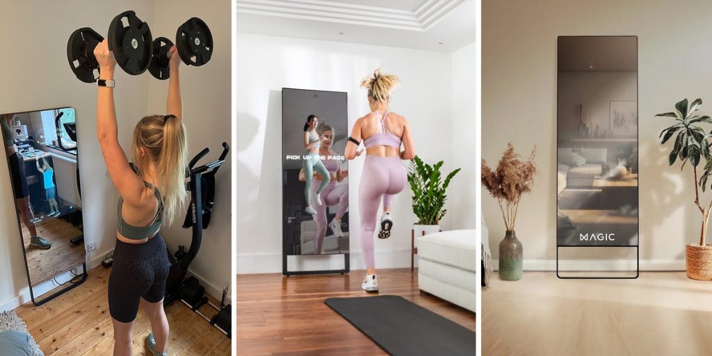 To put it as simply as possible, the Magic fitness mirror harnesses artificial intelligence to track your workouts in real time as you exercise in tandem with a personal trainer on the screen. You can see both yourself and the PT, so it’s easy to mirror your form to reflect that of the trainer’s.
